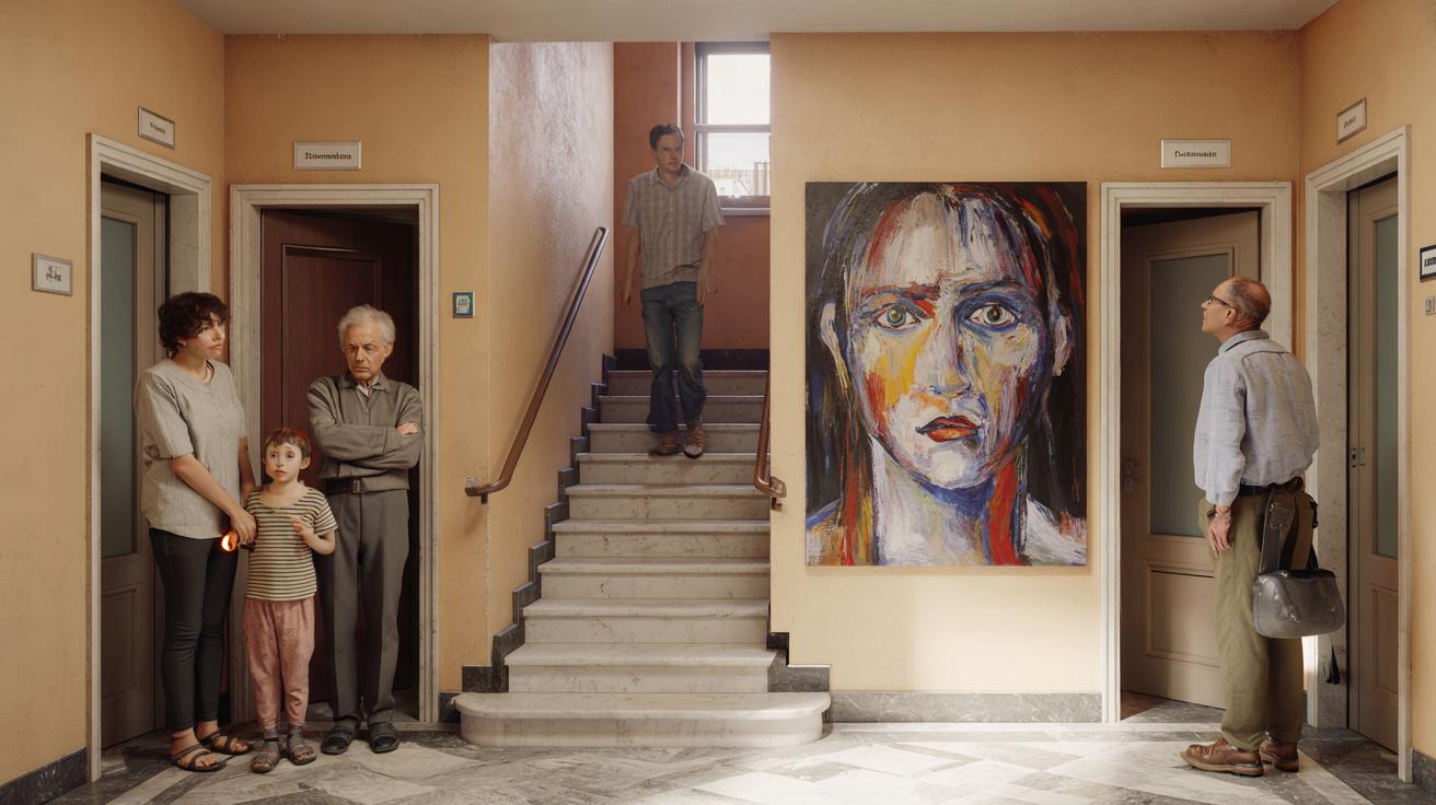 Alle 7.42 del mattino, nel pianerottolo di un anonimo condominio di provincia, qualcuno ha già perso la pazienza. Una porta si apre di scatto, uno sbuffo, un “non se ne può più di ‘sto quadro” lanciato nel vuoto delle scale. Sulla parete, incorniciata in modo quasi ostentato, l’opera dello “strano artista del terzo piano”: colori forti, volti scomposti, uno sguardo che sembra seguire chi sale e chi scende. Qualcuno accelera il passo, qualcuno abbassa gli occhi, qualcuno sorride di nascosto.