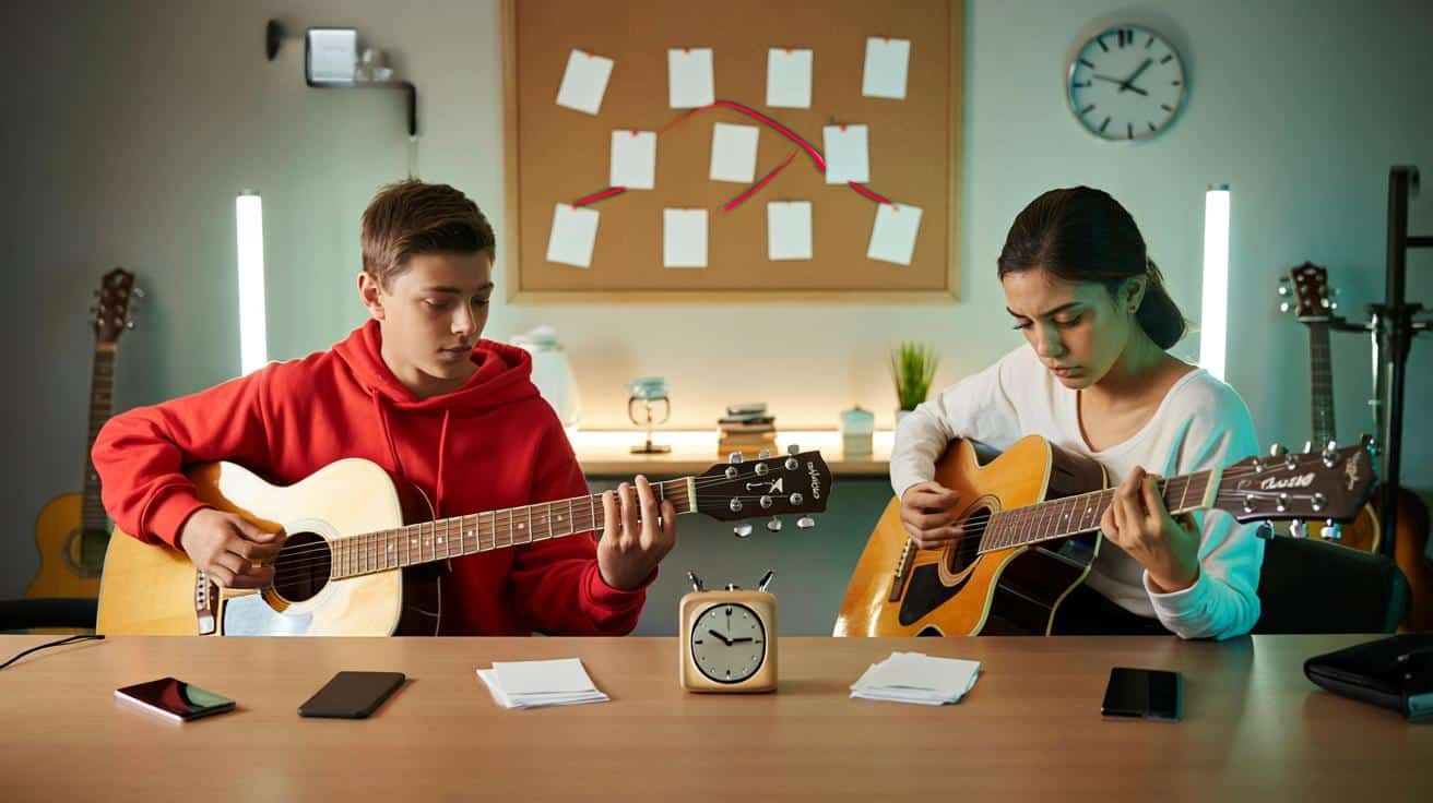 A lezione di chitarra, il ragazzo con la felpa rossa prende lo strumento per la seconda volta e fa scorrere le dita come se avesse già suonato per mesi. La maestra lo guarda, sorride, fa un cenno con la testa, mentre l’altra allieva, attenta e testarda, ripete lo stesso accordo cinque volte senza riuscire a domarlo. Nella stessa stanza, due velocità che corrono su binari diversi, due storie che si scrivono sotto gli stessi neon e lo stesso orologio appeso al muro.